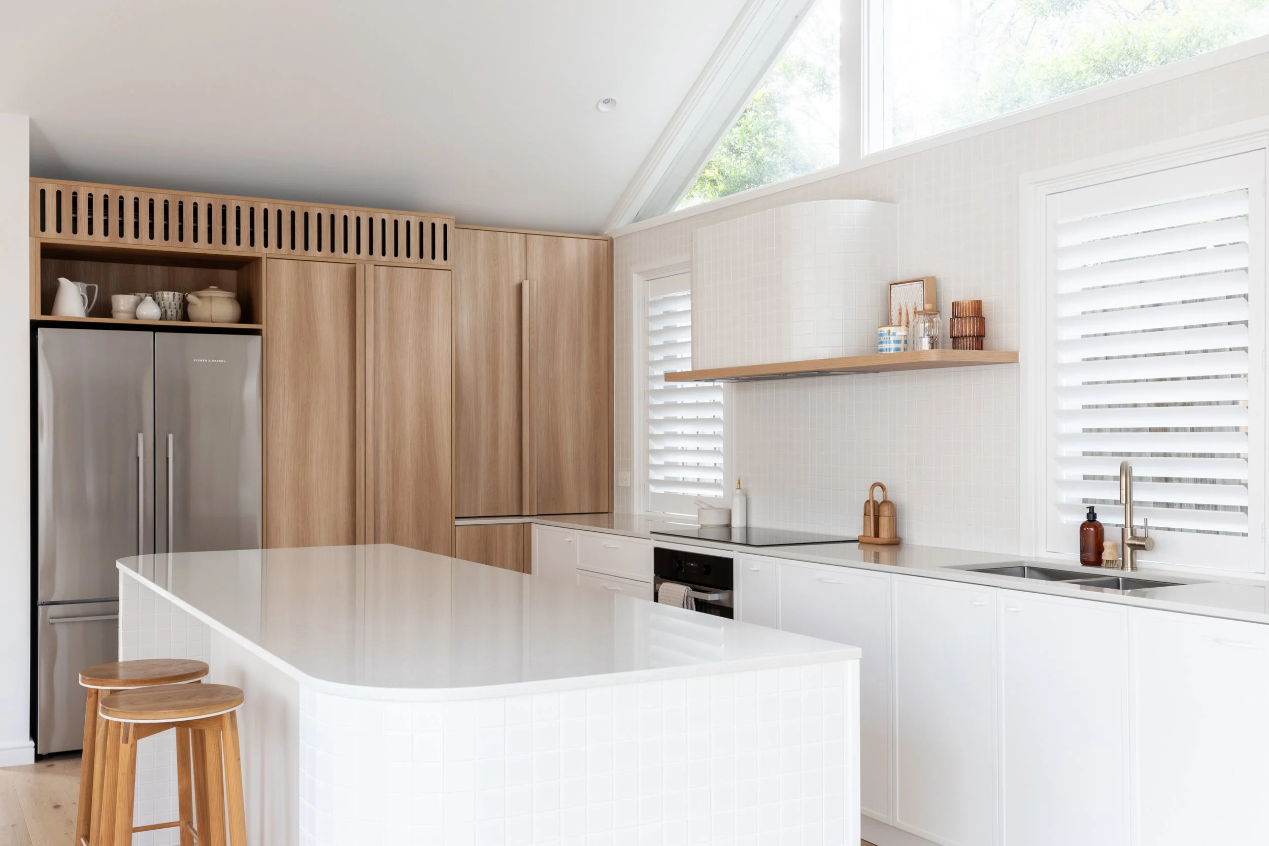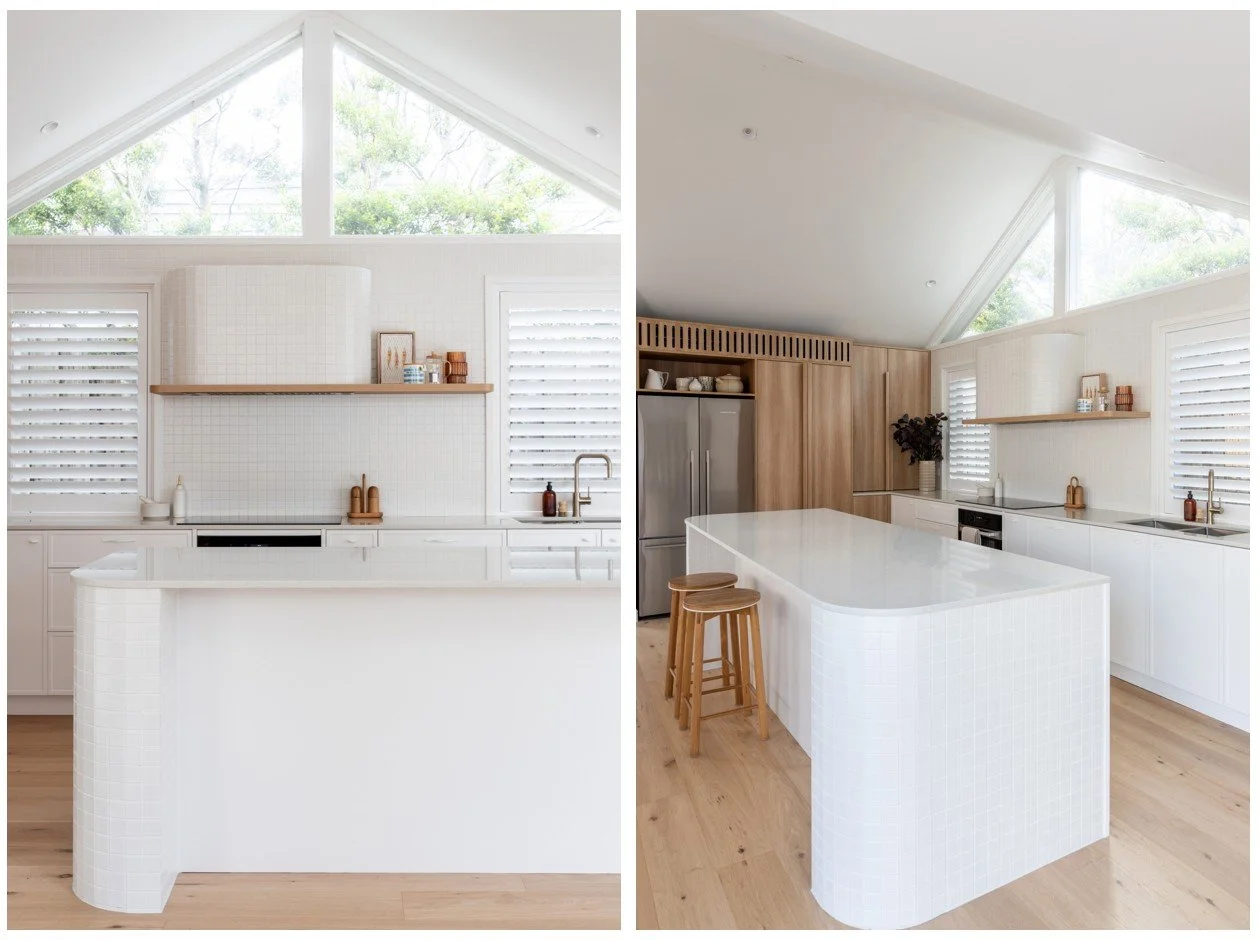 The tiled elements were equally considered. The radius of the island and the curved rangehood meant standard tile layouts wouldn’t cut it. Tile selection, sizing and set-out were tested carefully to ensure they wrapped cleanly without awkward cuts or distortion.