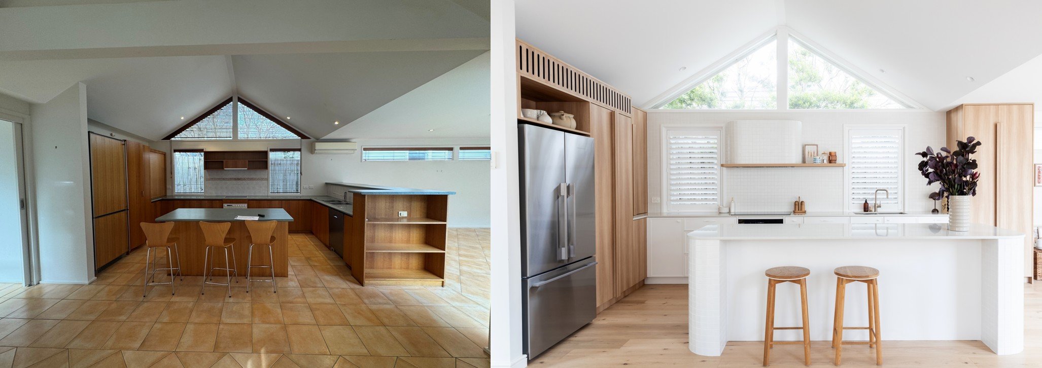 The original space was a very different story: a U-shaped kitchen with a raised 90s-style ledge cutting off the connection to the dining area, a small, awkward island that didn’t really serve a purpose, and a mix of aqua green benches, timber and terracotta-look floor tiles. It felt enclosed, segmented and visually busy.