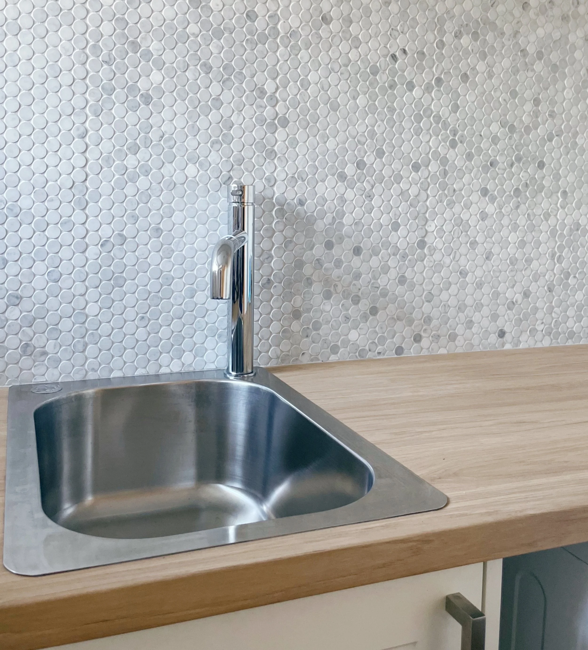 The laundry was also overhauled with warm timbers and playful penny round tiled splashback.