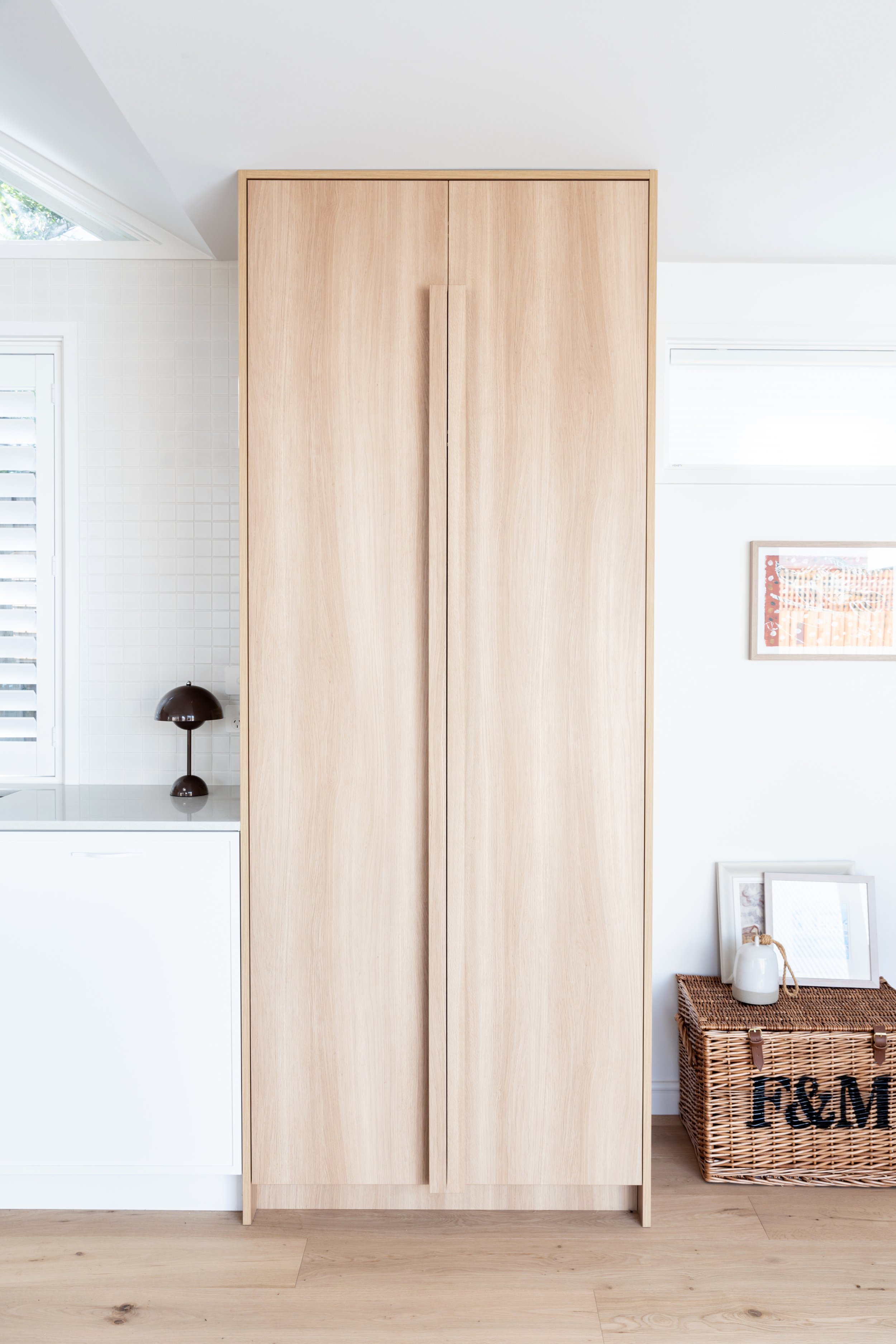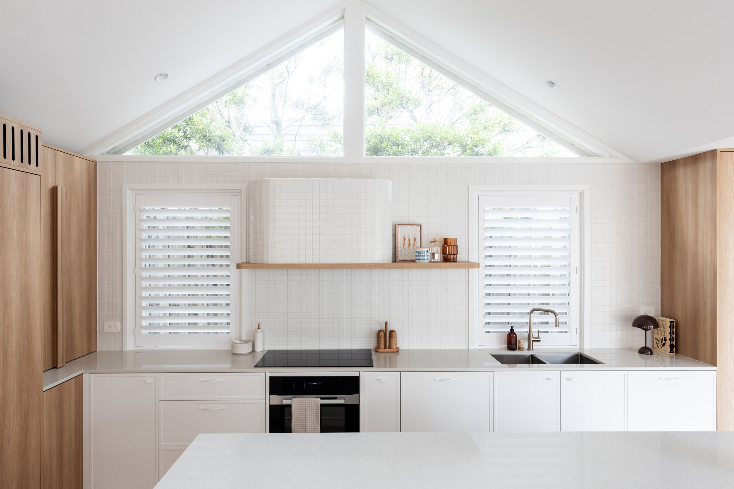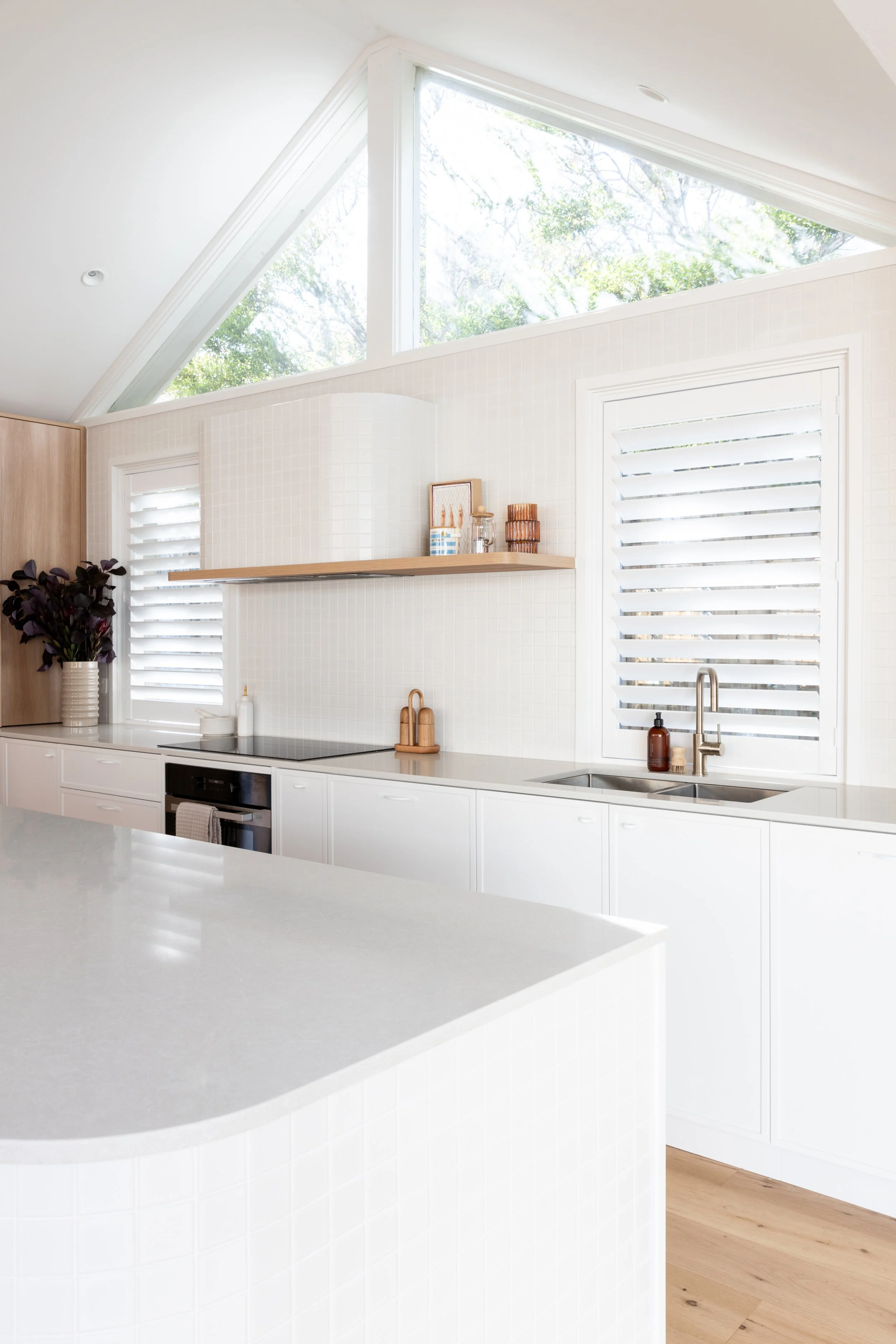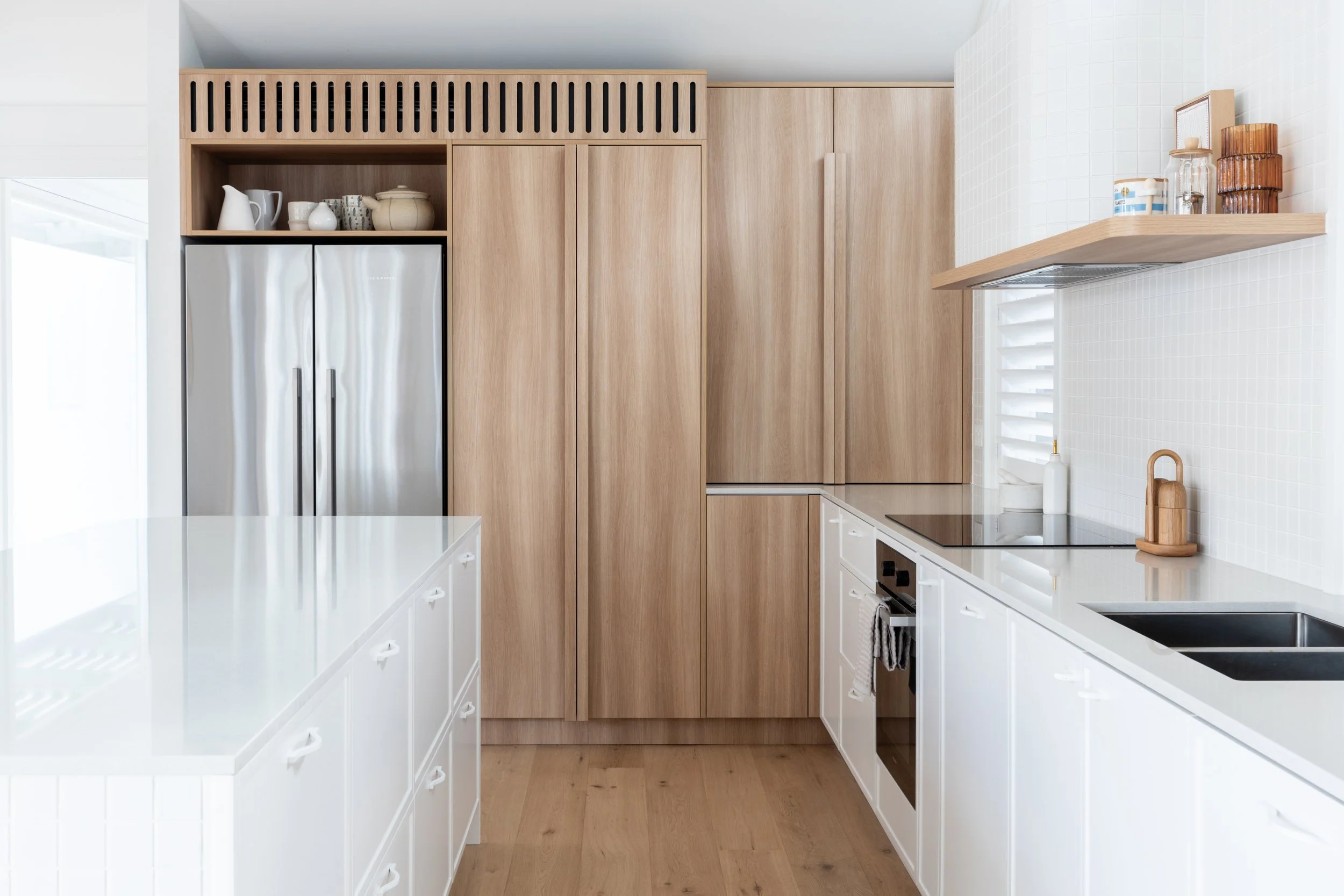 Materiality was approached with restraint. Timber veneer joinery brings warmth and texture, balanced by crisp white cabinetry that blends seamlessly into the architecture. Soft grey benchtops and grid-format tiles introduce subtle layering, while curved detailing - seen in the island ends and handles - adds a quiet softness to the overall composition.