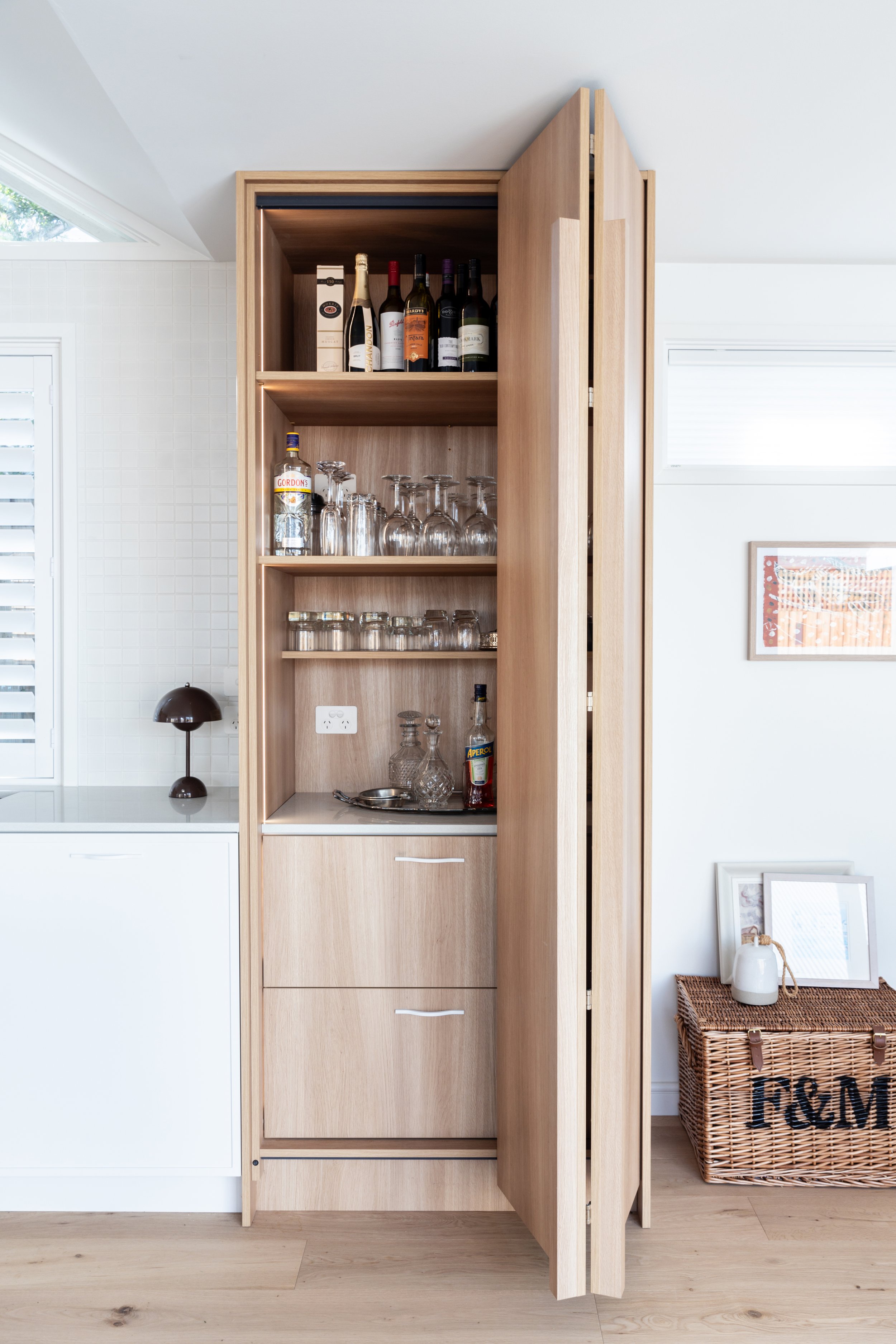 A full-height bar cabinet defines the transition to the dining space. More than just storage, it acts as a visual bookend to the kitchen, grounding the layout and reinforcing the connection between zones.